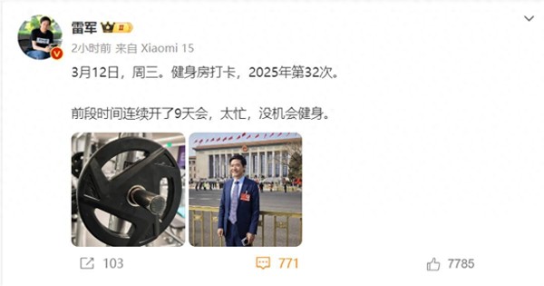 3月12日6时许,雷军更新微博:健身房打卡,2025年第32次。他在文中解释说:“前段时间连续开了9天会,太忙,没机会健身。”