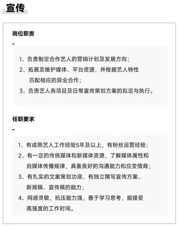 宣传经纪:负责公关,包括撰写文案、活动通稿和各种宣传策划;