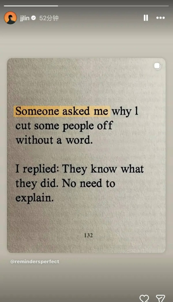 近日,有网友于洛杉矶偶遇44岁的林俊杰与一名女生同行,网传该女生是23岁网红“七七”,相关消息随即引发网友热议。25日,林俊杰更新快拍,配图上写着:“有人问我为何悄无声息地与某些人断绝来往。我答道:他们心知肚明,无需多言。” 随后又在评论补充:“耐心… ”许多网友猜测林俊杰疑似回应恋情。