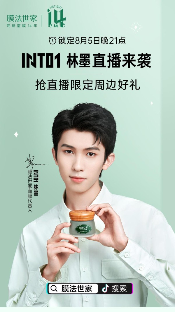 8月5日,面膜代言人INTO1林墨来到膜法世家抖音直播间,与粉丝观众分享自己的护肤诀窍。从练习生到男团成员,INTO1林墨鬼马有趣的性格和舞台上的专业表现形成鲜明“反差萌”,圈粉无数,当晚大批粉丝涌入膜法直播间为他助阵。直播间中,这位可爱的大男孩,为粉丝们奉献了“卡点连拍”和在线“袋鼠摇”表情包,还用泥浆面膜创作表情包,直播气氛十分活跃。