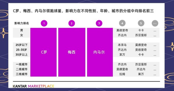 揭秘不同细分人群的足球明星偏好。在足球界,C罗、梅西、内马尔这三位巨星凭借其超凡影响力,无疑占据着主导地位。然而,除了他们之外,其他足球明星在不同性别、年龄和城市细分人群中的受欢迎程度则各有差异。