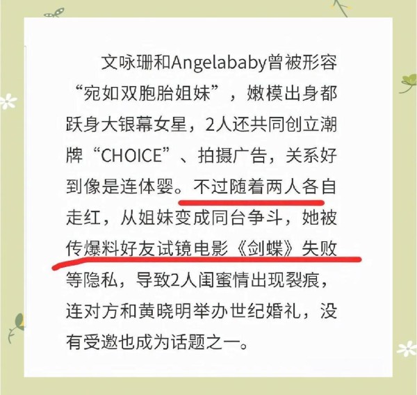 两年后,文咏珊正式进军影视剧领域,开始了她的演员生涯。而在随后的一年,她更是与Angelababy杨颖携手创立了潮牌,展现了她在时尚设计方面的才华,从而成功转型为明星设计师。文咏珊和杨颖曾经有过合作与误会,最终导致两人关系疏远。关于裂痕的起因,曾有传闻指文咏珊揭露了杨颖试镜《剑蝶》的失利等私密事宜,从而引发了姐妹间的嫌隙。此外,在杨颖与黄晓明举办婚礼时,文咏珊未受邀请,此事也曾一度成为外界热议的焦点。