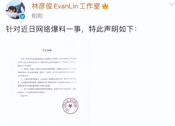 上午11点34分,林俊彦工作室坐不住了,火速出来解决问题,发声明否认嫖娼。针对网络爆料问题,特此声明如下,称有部分网友编造林彦俊先生嫖娼等不实爆料针对网络用户的诋毁行为已全权委托律师处理。