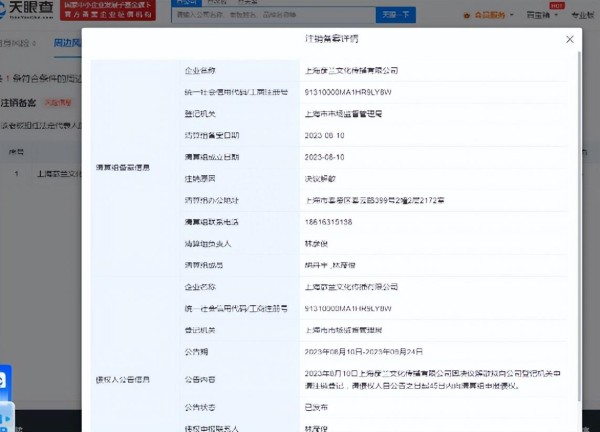 从天眼APP显示,林彦俊名下关联2家企业,均为存续状态。可其中一家,上海彦兰文化公司突然发布注销备案公告,公告期自8月10日至9月24日,注销原因为决议解散。