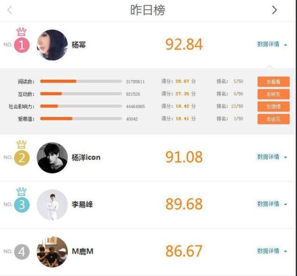 第一是杨幂,第二是杨洋,第三是李易峰。三位都是代言人,昨天所发的微博带来的流量让他们上了前三。而最近鹿晗似乎沉迷拍戏,也没有发博,难怪会掉到第四了。