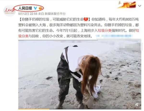 人民日报的官方微博转播了《极限挑战5》的节目视频,视频内容是几位大明星嘉宾亲力亲为地去外滩捡垃圾,此外,人民日报还强调随手扔掉的垃圾,会导致很多海洋动物受污染而死亡,并提醒到,上海将于7月1日起进入垃圾分类强制的时代。