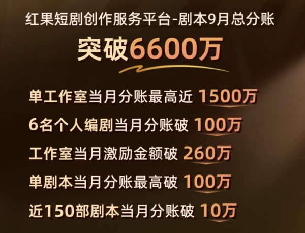 红果短剧创服平台公布的剧本9月份分账报告显示,九月单月剧本分账突破6600万。其中,单工作室当月分账最高近1500万,6名个人编剧当月分账破100万,近150部剧本当月分账破10万。