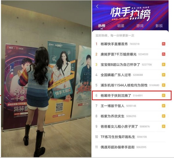 除了与粉丝进行最真实的互动,杨幂还在扫楼过程中隔空cue起了沈腾。之前在快手一千零一夜晚会上,穿着高跟鞋的杨幂扶沈腾扶了个寂寞,因此成了全网出圈梗。这次她在快手总部看见沈腾倾斜的海报牌,赶紧上前扶起,一扫“寂寞梗”的尴尬,还现场吐槽:“这和他本人差距也太大了吧。”在扫楼直播当晚,#杨幂终于扶到沈腾了#话题以1674W曝光量,登上快手热榜榜第六。