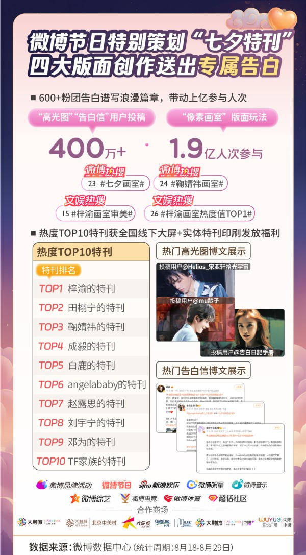七夕活动期间,微博推出的创新玩法实现线上线下贯穿联动。报告显示,600余粉团告白内容通过“高光图”“告白信”“像素画室”等形式呈现,累计带动上亿人次参与。热度TOP10特刊榜单中,@梓渝、@田栩宁、@鞠婧祎的特刊分列前三,#鞠婧祎画室#、#梓渝画室审美#等话题借势登榜热搜。TOP10特刊将同时斩获全国六大商圈大屏与实体特刊印刷发放福利,为数字化的爱意赋予可触摸的温度。