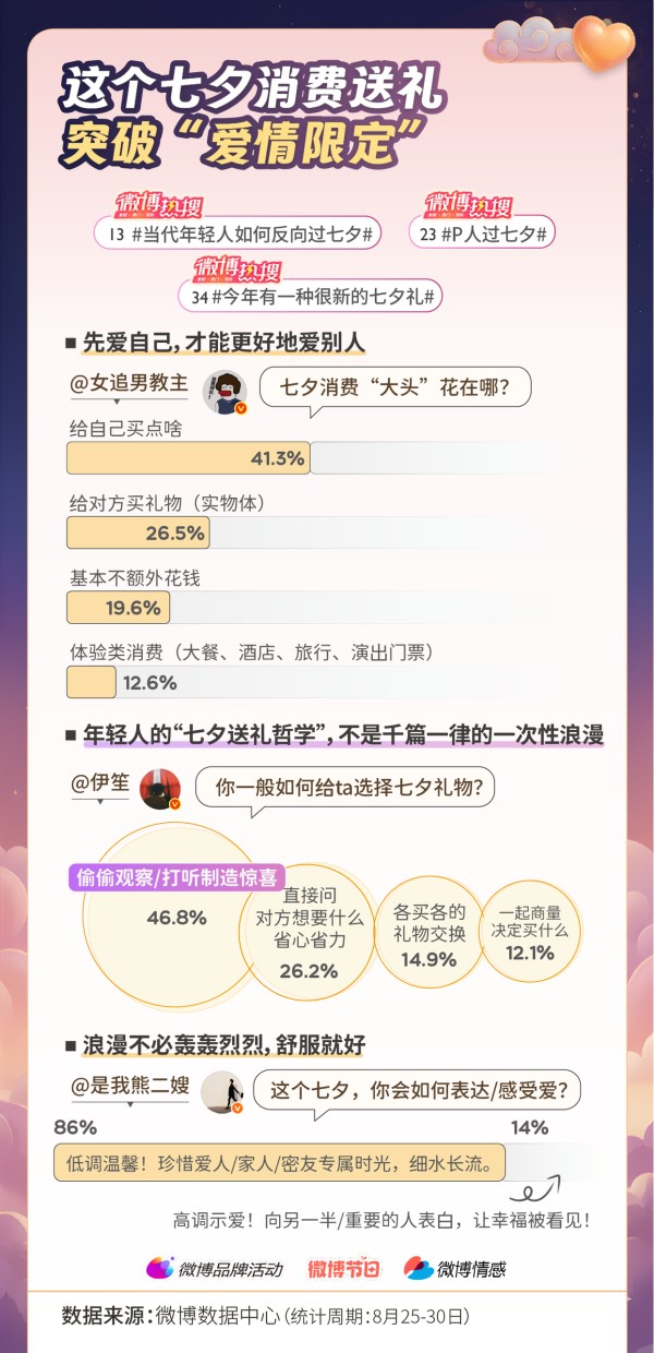 微博调研数据,还进一步勾勒出当代年轻人独特的“七夕送礼哲学”。报告显示,今年七夕消费,“先爱自己,才能更好地爱别人”成为恋爱消费主导理念。@女追男教主发起调查发现,超四成受访者优先选择“给自己买点啥”,远超给对方买礼物的近三成。在@伊笙的调查中,如果要给对方送礼,近半数受访者偏爱“偷偷观察制造惊喜”。情感表达方面,@是我熊二嫂的调查显示,86%用户期望“低调温馨,细水长流”的过节模式,高调示爱者并不为多数。可见,浪漫不必轰轰烈烈,舒适自然的表达方式更受人群青睐。