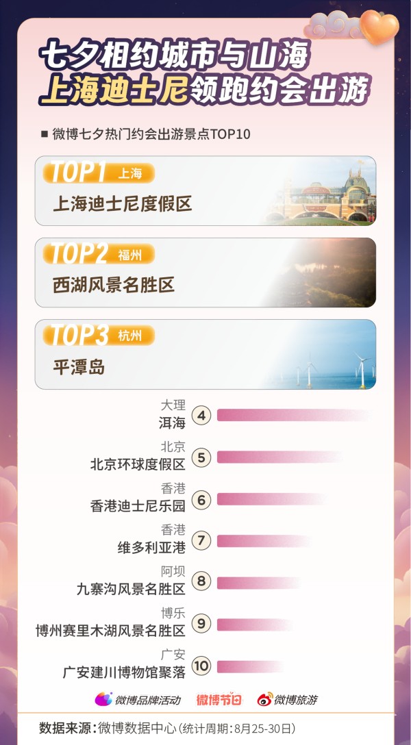 当七夕遇上旅行,伴侣们都要去哪里游玩?报告显示,微博七夕热门约会出游景点TOP10中,城市打卡是优先项目,上海迪士尼度假区居于榜首。同时,年轻人也想奔赴山海,杭州西湖和福州平潭岛分列二、三位。此外,大理洱海、北京环球度假区、香港迪士尼乐园、香港维多利亚港、阿坝九寨沟等横跨南北的景点悉数上榜,勾勒出从都市繁华到自然风光的多元约会版图。从主题乐园到名山大川,这届年轻人用脚步丈量爱情,七夕浪漫也不限于烛光晚餐。