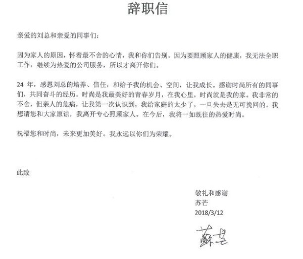 就在近日,时尚芭莎创意总监苏芒提交辞职报告,将在2018年5月8日正式离职,苏曼的辞职理由是这样:因为家人的原因,怀着最不舍的心情,我和你们告别,因为要照顾家人的健康,我无法全职工作,继续为热爱的公司服务,所以才离开你们,这样的辞职报告在网友认为:只需要看看