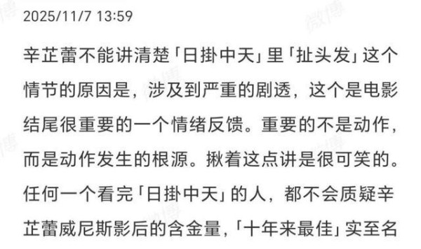 这番话立马被网友联想起最近大热的《日褂中天》,毕竟里面确实有一场让人印象深刻的扯头发戏份,而这部片子也是辛芷蕾斩获大奖的重要作品。