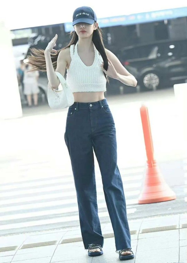 纯白色针织材质的运动背心搭配深蓝色高腰直筒牛仔裤,简约随性又很亲民,明明是坐拥无数粉丝的名人,在这一刻却像邻家小妹一样沉闷含蓄,亲和力满分。