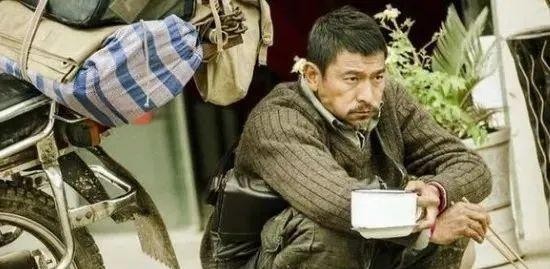天王刘德华在剧中饰演了一个农民工作角色,蹲在摩托车后,一手捧着老式搪瓷饭缸,一手执筷,眼神中透出沧桑。他皱着眉头凝视前方,演技精湛,令人信服。看着他这番模样,不禁让人产生同情与心酸之情,仿佛真见到了一位被生活重压的农民工。