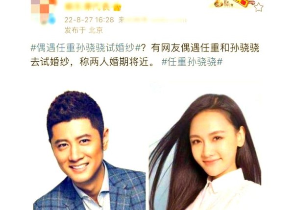 据报道,最初是一位网友在北京市国贸附近的一家婚纱店偶然遇到了试穿婚纱的任重与孙骁骁。随后,接到该爆料的媒体向知情者进行了求证,得到的回应是 任重与孙骁骁确实已经试穿了婚纱,似乎婚期已近。 起初,网友的爆料缺乏照片等证据,但经过媒体与知情人士的确认后,这一消息逐渐得到了广大网友的认可。
