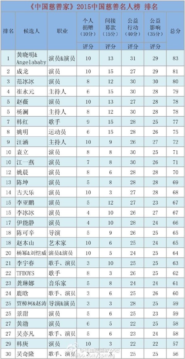 2015中国慈善名人榜出炉 黄晓明Baby成