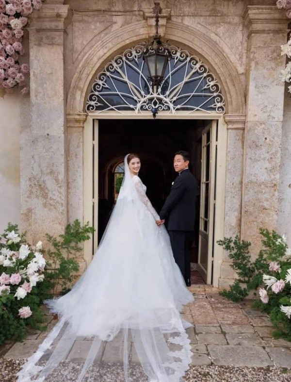 婚礼当天,吴千语身着一袭定制婚纱,如同从画中走出的仙子一般,美得令人窒息。婚纱采用轻盈的蕾丝面料,剪裁合身,勾勒出她曼妙的身姿。裙摆铺展开来,如同一片洁白的云朵,轻盈而梦幻。她的发间佩戴着简约而高雅的头纱,更添几分温婉与柔美。