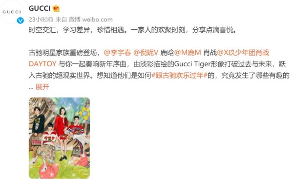 1月6日GUCCI官微分享了虎年大片,并发长文:1.时空交汇,学习差异,珍惜相遇。2.古驰明星家族李宇春、倪妮、鹿晗、肖战重磅登场,奏响新年序曲。3.由淡彩描绘的Gucci Tiger形象打破过去与未来的精彩大片,期待!