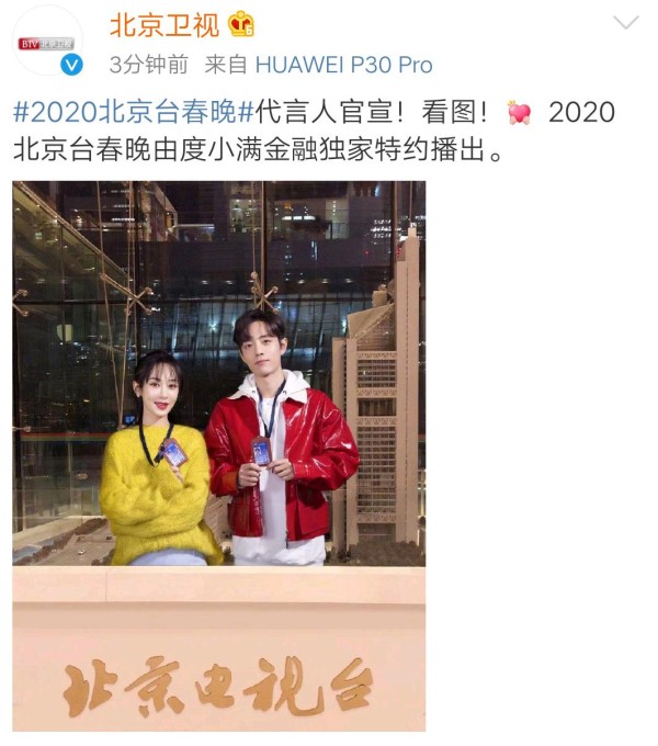 12月20日,北京电视台正式官宣肖战和杨紫成为其2020年春晚代言人。肖战身穿红色卫衣白色打底戴着写有他生日No.1005的工作牌,杨紫身穿黄色毛衣白色打底戴着写有她生日No.1106的工作牌,在“北京电视台”门前合照留念,他们二人将联袂代言2020北京台春晚。