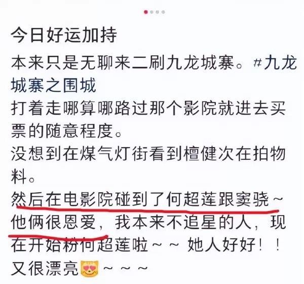 此外,有网友在电影院偶遇何超莲和窦骁,称赞他们是一对恩爱的夫妇,并表示自己开始成为何超莲的粉丝,因为她不仅人美心善,还非常漂亮。