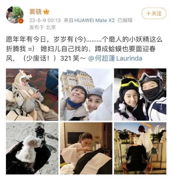 在去年的生日那天,何超莲和窦骁一起到国外滑雪庆祝。窦骁调侃称他的爱人是磨人的小妖精,笑着说媳妇是自己找的,别废话。