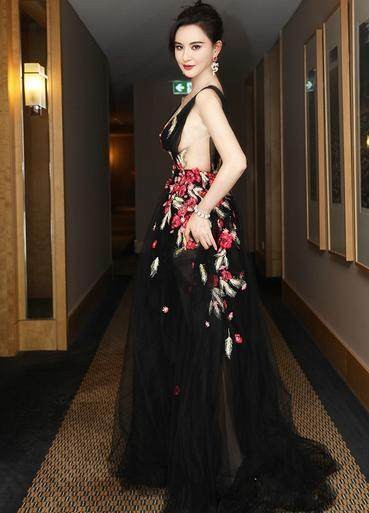 一袭薄纱碎花连衣裙,拖地的裙摆,高端优雅,侧面看上去真空穿搭,很是性感,裙身上的花瓣装饰,给人一种只可远观不可亵玩的感觉。