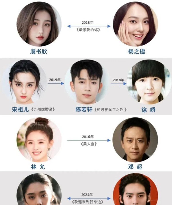 这种现象背后是制片方的选角逻辑:欢娱系内部消化白鹿许凯,恒星引力重复启用王鹤棣虞书欣,既降低磨合成本,又延续观众嗑CP的热情。 张凌赫的两次闭环路径更具典型性,从白鹿到田曦薇再到王星越的循环中,欢娱系演员占据三席;而徐若晗→张凌赫→白鹿的三角则显示甜宠专业户与年下男演员的精准匹配。