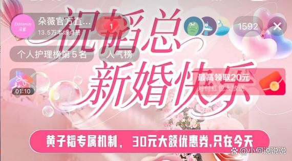 而就在婚礼直播结束后,黄子韬自创的卫生巾品牌“朵薇”冲上了个人护理榜第一名。