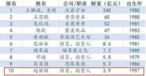 虽说距离年底还有一段时间,不过关于赵丽颖的收入,大家从去年的榜单中可以推测出一二,这个榜单叫做“80后富豪榜”,赵丽颖跻身前十,以3.9亿元收入与王思聪齐名,榜单中的女明星不多,可以看出赵丽颖的吸金能力并不弱。