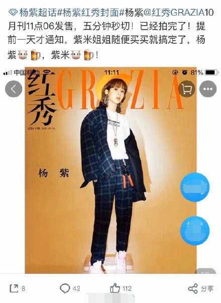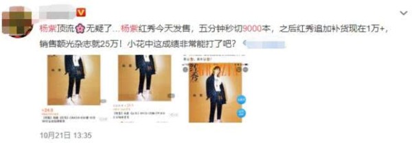 杨紫拍摄杂志封面的风格与赵丽颖相差较大,网友们因此并没有将过多注意力放在比较两人在杂志封面的表现力上,而是将两人的杂志销量进行了比较。杨紫杂志于10月21日开售,五分钟便售出了9000本,之后杂志又追加补货。