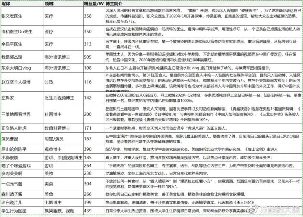 以下是我从微博内部拿到了一份2020年新晋红人的名单,可以看到,微博红人的覆盖领域更加广泛,从明星、搞笑、电商扩展至医疗、资讯、科普、教育、美食等,与我们日常生活的结合也更加紧密,打破了外界的固有认知。