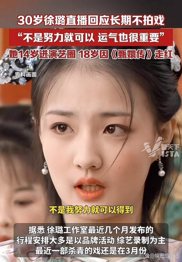 不仅是成熟年龄阶段的演员,年轻演员也并非一帆风顺。30岁的徐璐近期也在网络上透露自己的境况,直言努力固然重要,但运气同样不可忽视。她14岁便踏入演艺圈,如今却只能靠参加商业活动和综艺节目维持热度。对于剧本的挑选标准,徐璐表示自己也会有所筛选,不会随意接。
