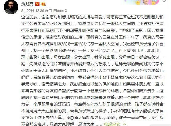 贾乃亮表示自己一家人每次出行都会迎来社会舆论,给他们一家人带来了非常大的困扰和伤害,并且表示自己因拍戏半年多的时间已经没有回家了,希望这样可以给女儿和李小璐一些个人空间,不希望社会舆论给李小璐和女儿带来任何伤害,想要倾尽全力保护家人!