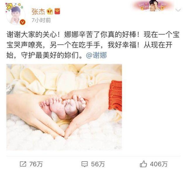 张杰谢娜的双胞胎出生,又给2月添一大喜之事,一时之间占据各大头版头条!张杰和谢娜发的微博更是引来的整个娱乐圈的祝福!两人手比心圈住两个小公主的四只小脚丫,没谁了!谢娜转发张杰微博并@张杰:杰爸,以后我们三姐妹请多多关照