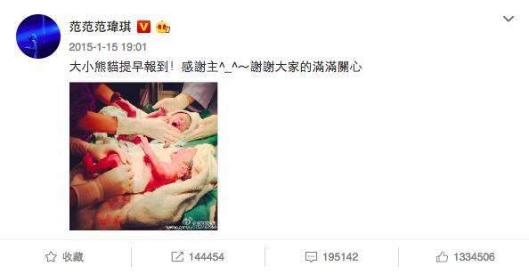还有一个也是生双胞胎儿子的范玮琪,范玮琪和黑人这对夫妇在娱乐圈是公认的恩爱夫妻。也是在2015年迎来了双胞胎儿子,从范玮琪发的微博中可以看到,双胞胎儿子是在预产期之前到来。她也在微博向粉丝好友的关心表示感谢,并配上孩子刚出生时的照片。