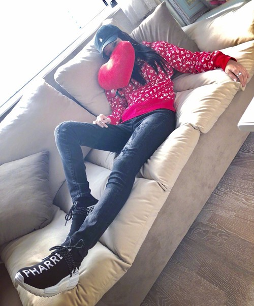 短款卫衣+高腰休闲拖地裤,很好的隐藏增高休闲鞋,轻松拥有大长腿!