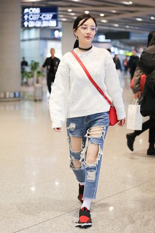 韩版毛衣+破洞牛仔裤,时尚减龄,红色挎包更是增添不少活力!