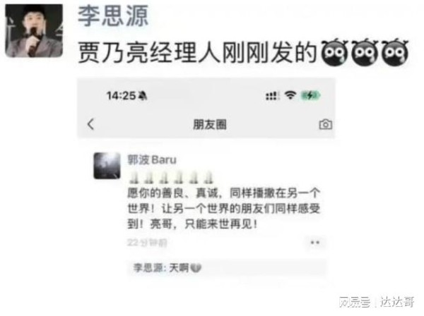 贾乃亮恢复单身后反而名气更响亮,演艺作品不断。 现年40岁的他,近日有网传称「贾乃亮去世」; 此外先前有网友截图了名为「郭波Baru」的朋友圈,并注明「贾乃亮经理人刚刚发的」,而后者发文内容为:「亮哥,只能来世再见」,引发网友猜测。 许多网友纷纷热议:「贾乃亮去世喔? 不会吧」、「等辟谣」、「贾乃亮去世不会吧,怎么可能不是几天前还在直播吗」。