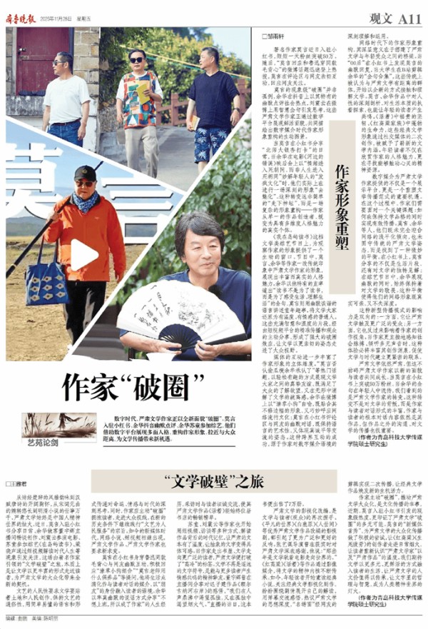 数字时代,严肃文学作家正以全新面貌“破圈”。莫言入驻小红书、余华抖音幽默点评、余华苏童参加综艺,他们借助数字平台展现多面人格,重构作家形象,拉近与大众距离,为文学传播带来新机遇。