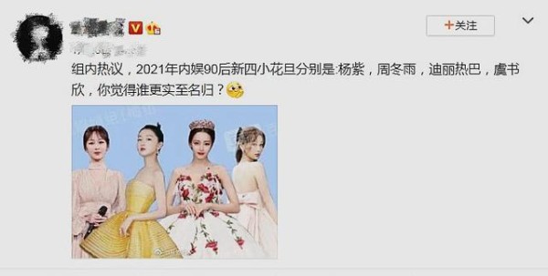 因此关于谁是“四小花旦”一直没有确切的定论,网络上每年都在选,2021年的组内热议也评出了新四小花旦,仍旧有一个女星被质疑,凭什么能上榜。