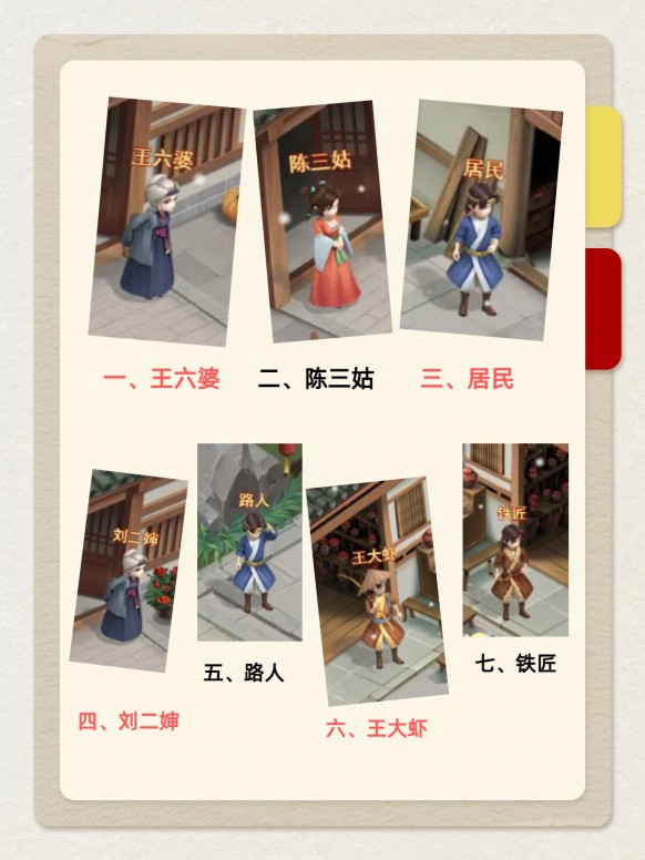 ①王六婆→②陈三姑→③居民→④刘二婶→⑤路人→⑥王大虾→⑦铁匠