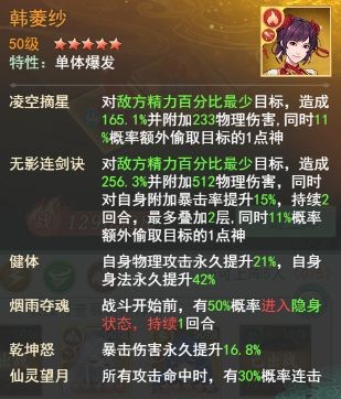 三手放置6号位,作为主力输出,负责收割残血敌人,确保云天河的绝技能攻击到中间一列小怪。韩菱纱对夕瑶的连击和暴击是打出高伤害的关键指标。