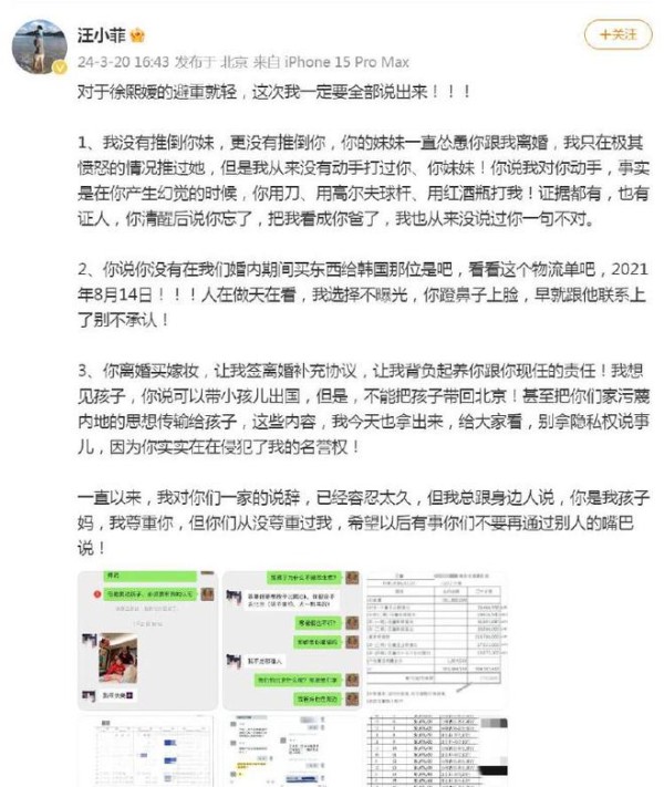 3月20日,在大S回应汪小菲婚内出轨的是你不是我后,汪小菲也通过微博表示,对于徐熙媛的避重就轻,这次我一定要全部说出来。