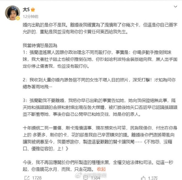 3月20日,@大S发文回应称:“婚内出轨的是你不是我。离婚后我确实为了泄愤刷了你几次卡,但这是你自己签字允许的,重点是我并没有刷你的卡买任何东西给我先生。” 具体内容如下!