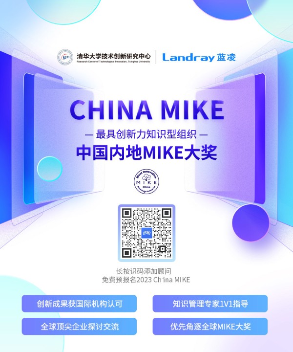 清华大学技术创新研究中心、香港理工大学知识管理及创新研究中心、深圳市蓝凌软件股份有限公司等机构于2018年共同发起,将MAKE大奖升级为最具创新力知识型组织(MIKE)大奖,同时启动China MIKE大奖评选,旨在挖掘知识管理创新应用最佳实践,进一步推动知识管理的普及与共享。