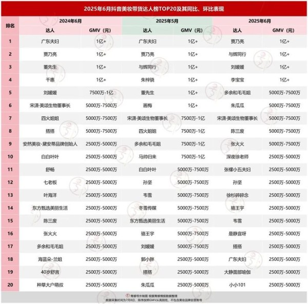 整体来看,6月TOP20中GMV破亿或处于7500万-1亿区间的达人共计4名,略少于2024年同期的5名。就环比而言,今年5月该数量曾达到6位,同样多于6月。