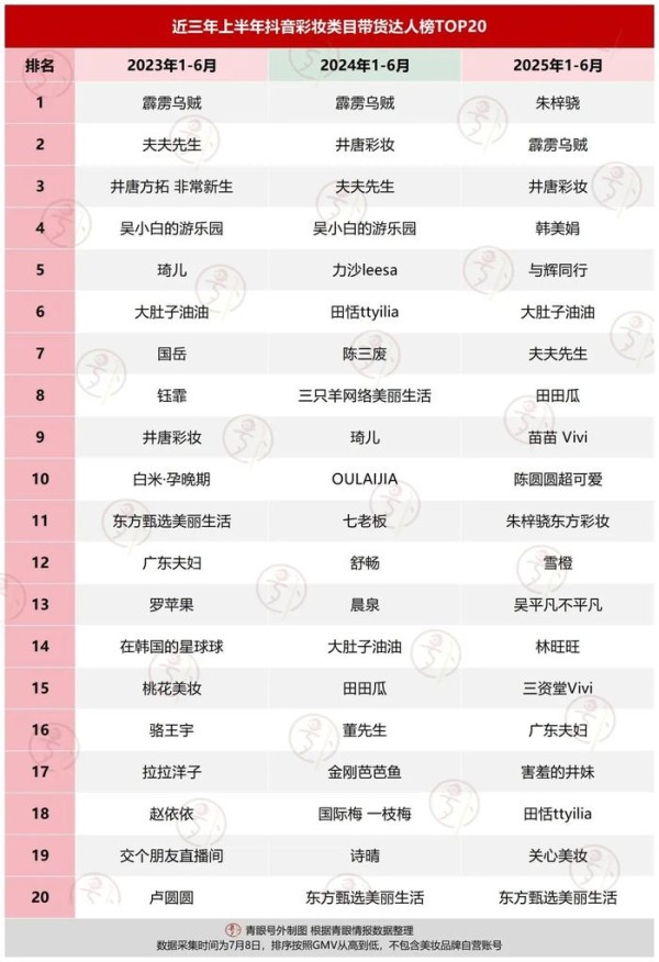 与此同时,青眼号外还梳理了近三年上半年抖音美妆TOP20带货达人榜单,归纳出三大特征: