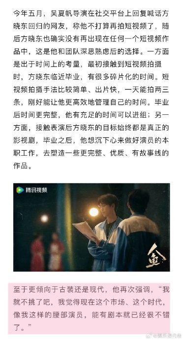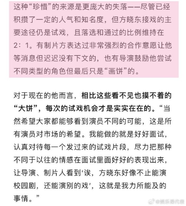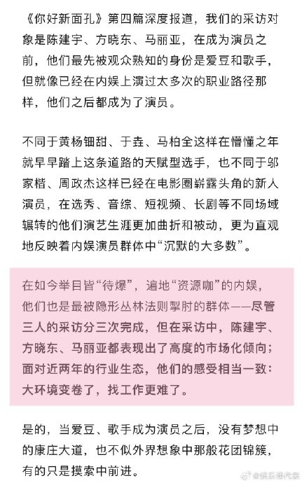 #内娱的尽头是演戏是偏见吗##腰部新人觉得行业越来越卷了# 尽管“转型”已经几乎成为所有当红艺人的必答题,但对于非当红艺人而言,更迫切的需求是找到那个匹配度足够高的标签。 @方方方晓东 觉得现在有剧本演就已经很幸运了;@马丽亚maria_ 对于“适合演恶毒女配”的评价则表示,标签某种程度上反而是自己的优势;@陈建宇DeDe 认为演员是先有业务能力,才有赛道一说,丝毫不担心“短剧演员”这个标签会影响自己将来接戏。#你好新面孔!#↓