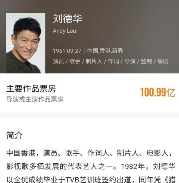 刘德华在内地票房收益,突破百亿网民币,成为港星第一人
